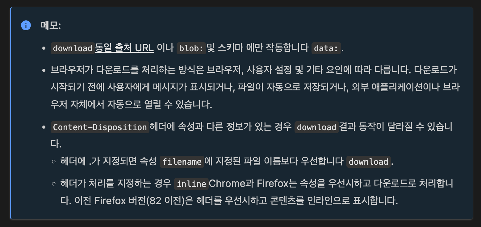 백엔드 개발자분께 문의를 드려보니 원래 그렇게 구현하려고 하셨는데 깜빡하셨다고 했고, 작업 후 확인해보니 다운로드가 잘 되었다.