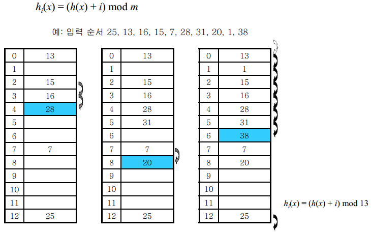 1) Linear Probing : 고정폭으로 이동하여 빈 공간을 찾음